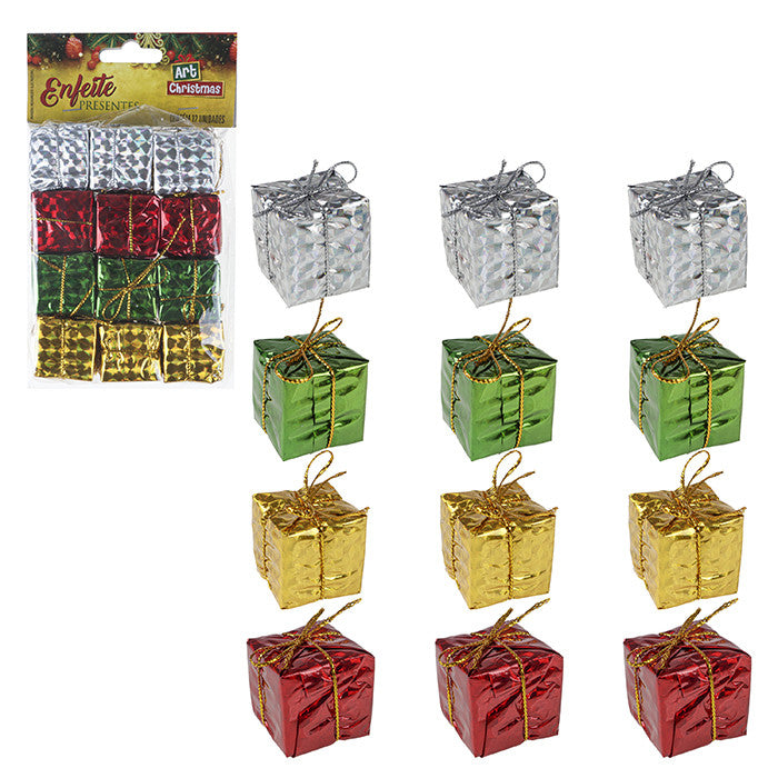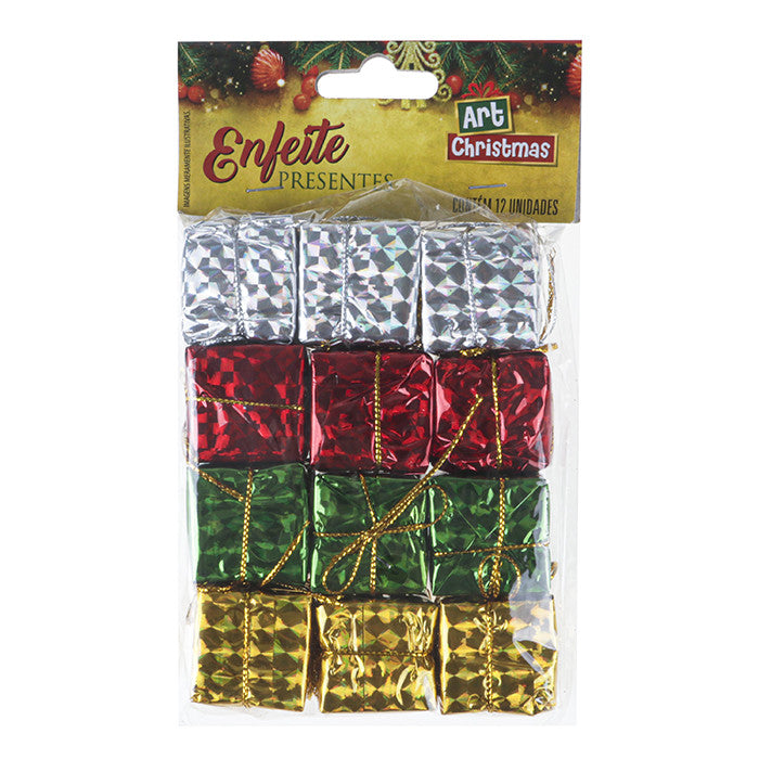 Dê um toque mágico à sua decoração natalina com nossas encantadoras mini caixinhas de presente, projetadas especialmente para adornar a sua árvore de Natal. Cada conjunto vem com 12 unidades coloridas, proporcionando uma explosão de alegria festiva.
